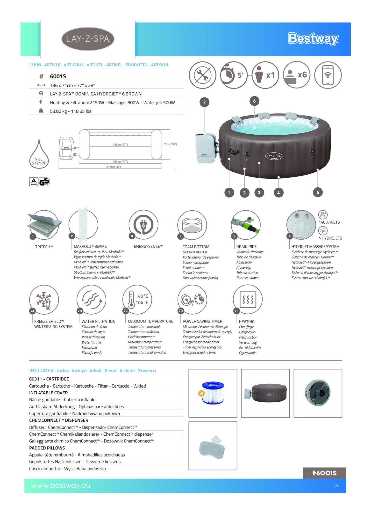 La temperatura dell’acqua raggiunge i 40°C per assicurare il massimo comfort e relax. Inoltre, la tecnologia Freeze Shield impedisce all'acqua di congelare quando l'idromassaggio non è in funzione, evitando possibili danni ai componenti. Il sistema di massaggio HydroJet combina l’azione di 4 idrogetti direzionabili, posizionati sulle pareti, a quella dei 140 getti ad aria calda che risalgono dal fondo. La pompa multifunzione esterna gonfia la vasca, riscalda l'acqua, gestisce il filtraggio e controlla il sistema di massaggio. Il pannello di controllo è facilmente raggiungibile dall'interno della vasca e include portabicchieri per bibite e snack. L'idromassaggio Lay-Z-Spa Dominica HydroJet può essere controllato dal tuo dispositivo grazie all'app Bestway SmartSpa: puoi impostare la temperatura perfetta, attivare il timer di risparmio energetico, programmare il sistema di filtraggio e quello di massaggio. La struttura interna in materiale MaxHold offre grande stabilità e resistenza alla pressione, pur restando leggera. Il materiale multistrato EnergySense, con cui sono realizzate le pareti e il telo di copertura, è progettato per prevenire la perdita di calore, rendendo Lay-Z-Spa Dominica fino al 40% più efficiente dal punto di vista energetico rispetto agli idromassaggi gonfiabili tradizionali.