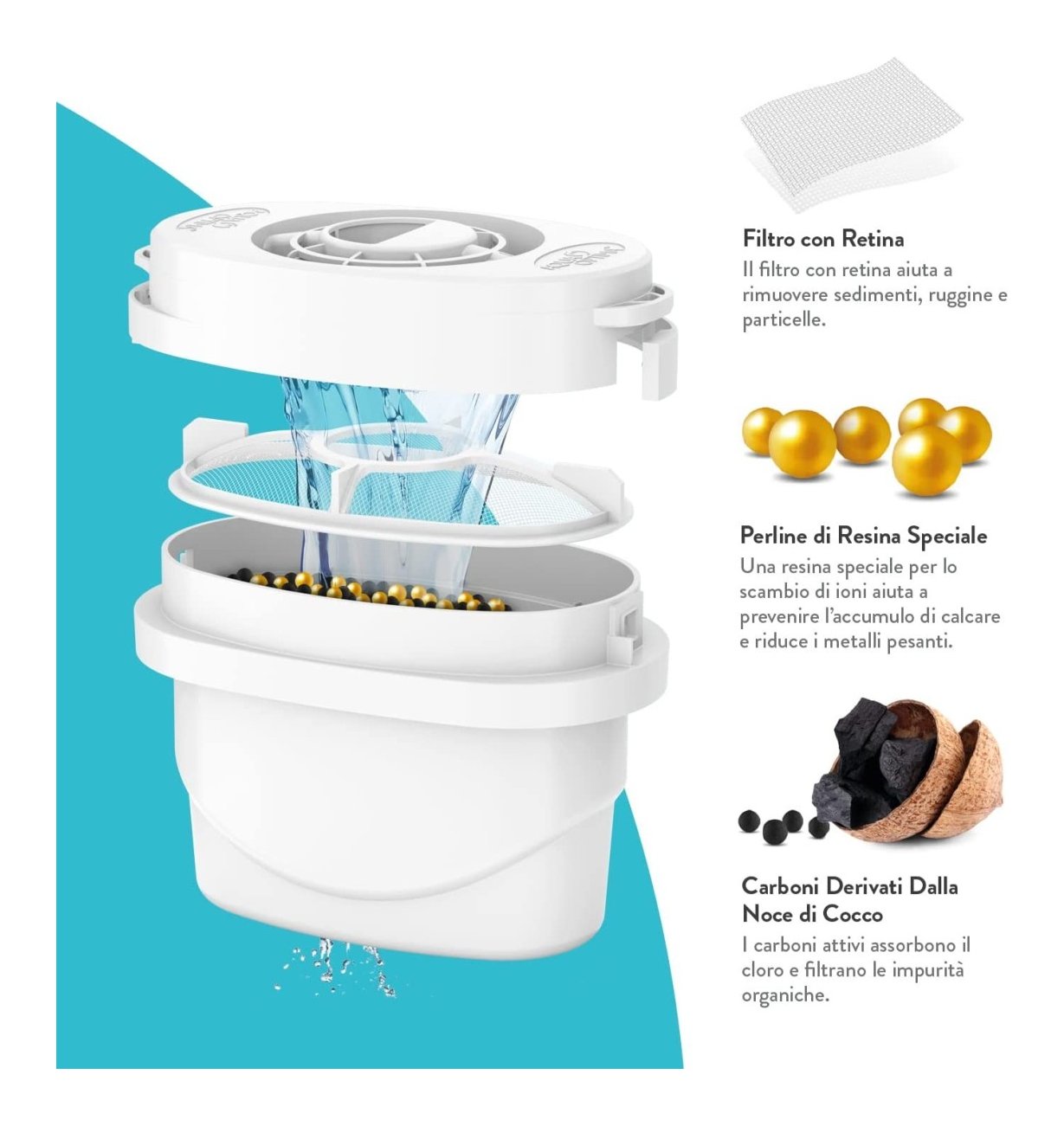 Si consiglia di cambiare il filtro dell'acqua ogni mese circa. Ogni filtro Aqua Optime Evolve+ pulisce 100 litri di acqua del rubinetto (a seconda della qualità e della durezza dell'acqua). In base all'uso tipico, questa confezione da 3 fornirà fino a 3 mesi di acqua potabile più pulita e più pura