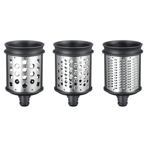 Tre cilindri aggiuntivi da utilizzare con l'accessorio 5KSMVSA. Viene fornita con un cilindro per la riduzione in purea, un cilindro per tagliare a julienne e un cilindro per grattugiare finemente. I cilindri sono realizzati in acciaio inox.
