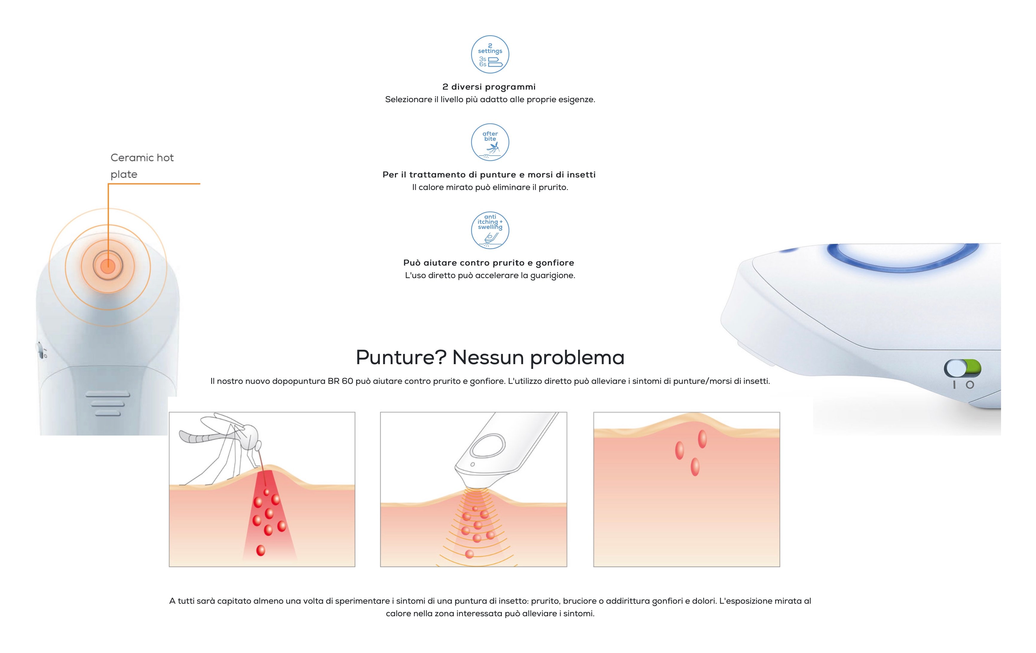Per un trattamento senza additivi chimici è stato sviluppato il dopopuntura BR 60. Da avere sempre con sé a casa e in viaggio. Può aiutare contro prurito e gonfiore. Lo sviluppo di calore può accelerare la guarigione. Senza sostanze chimiche, utilizza solo il calore ed è quindi adatto anche in gravidanza. Dispositivo classificato IP42, funzionamento con due batterie AAA 1,5v
