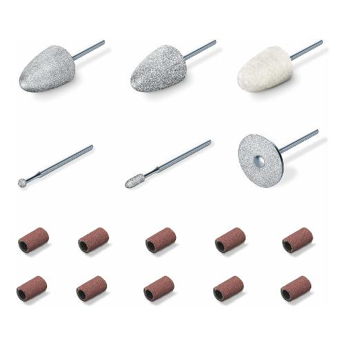 Include 6 accessori in zaffiro e feltro di alta qualità: Disco in zaffiro, a grana fine: per limare e rifinire le unghie, a grana fine. Lima in zaffiro, a grana fine: rimozione di pelle secca, calli o duroni sulla pianta dei piedi o sui talloni e rifinitura delle unghie. Lima in zaffiro, a grana grossa: rimozione rapida di calli spessi o duroni di grandi dimensioni sulla pianta dei piedi e sui talloni. Questo accessorio è adatto per superfici ampie. Lima in feltro: per lisciare e lucidare il bordo delle unghie e pulirne la superficie dopo la limatura. Fresa a fiamma: per liberare le unghie incarnite. Fresa in zaffiro circolare: per rimuovere attentamente i calli. Inclusi 10 accessori monouso in carta abrasivamanicure
