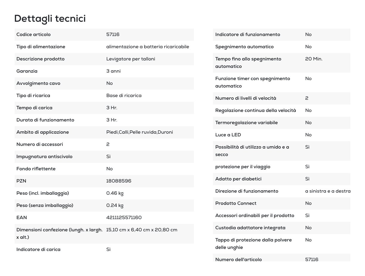Con l'MP 59 puoi liberare i tuoi piedi in modo efficace e senza sforzo da fastidiosi calli, duroni e pelle ruvida. Il levigatore per talloni è dotato di una potente batteria ricaricabile agli ioni di litio per una durata particolarmente prolungata ed efficace. Inoltre, il dispositivo è impermeabile e quindi adatto all'uso a secco e a umido. In dotazione 2 rulli levigatori asimmetrici (a grana grossa e a grana fine) per un'applicazione puntuale o su grandi aree del corpo