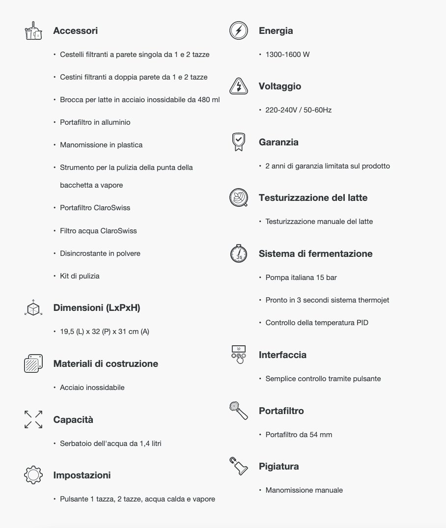 Grazie ai 4 elementi chiave, the Bambino è in grado di erogare un caffè di terza generazione proprio come una macchina professionale. Il portafiltro da 54 mm che contiene 18 grammi di caffè e la potente lancia vapore, ti regalano un caffè dal gusto pieno e una delicata schiuma con microbolle per la tua latte art. Con il sistema di riscaldamento brevettato Thermojet, la macchina è pronta in soli 3 secondi.