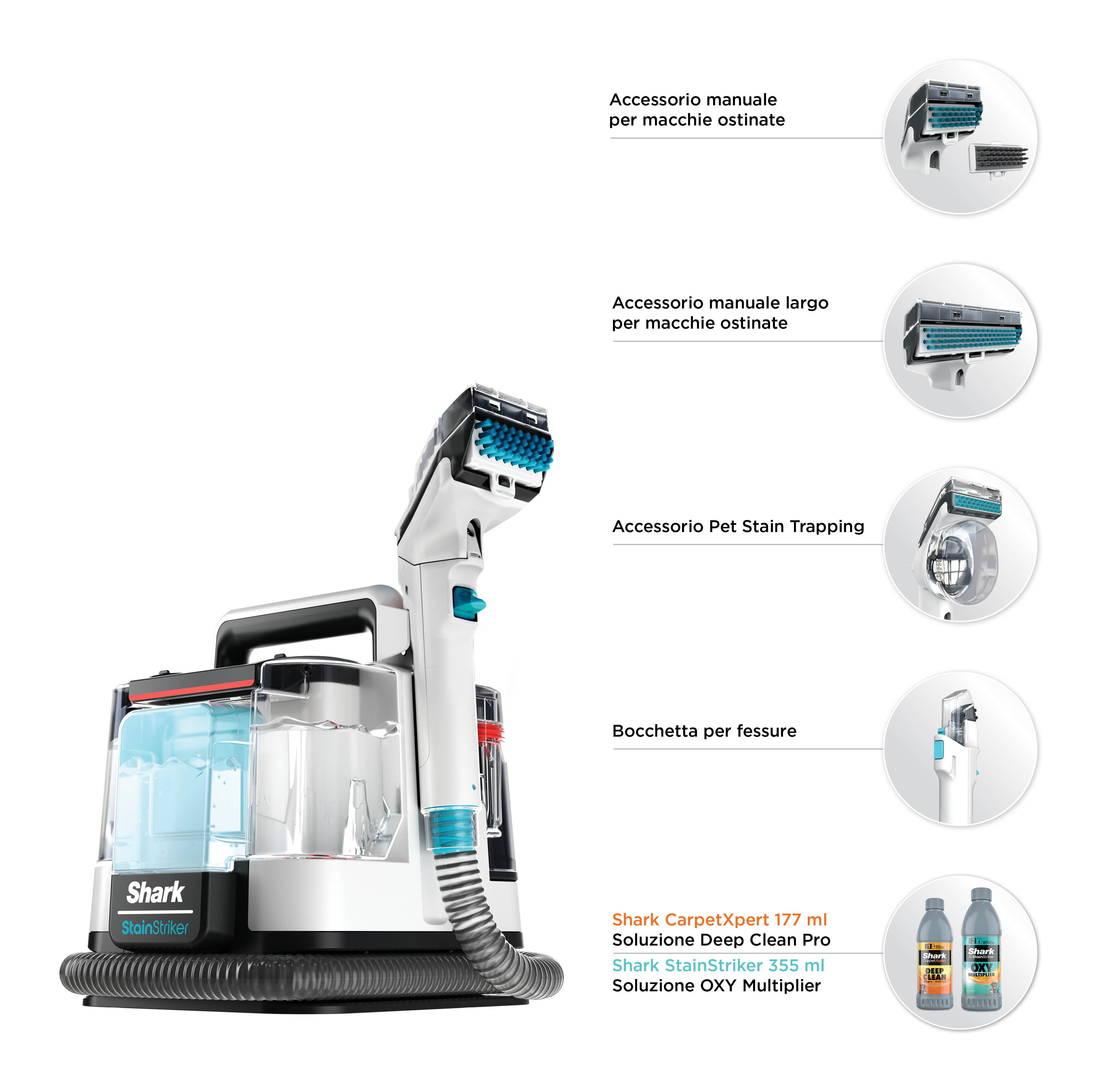 Completo di pet stain trapping, bocchetta fessure, bocchetta macchie ostinate, due soluzioni shark