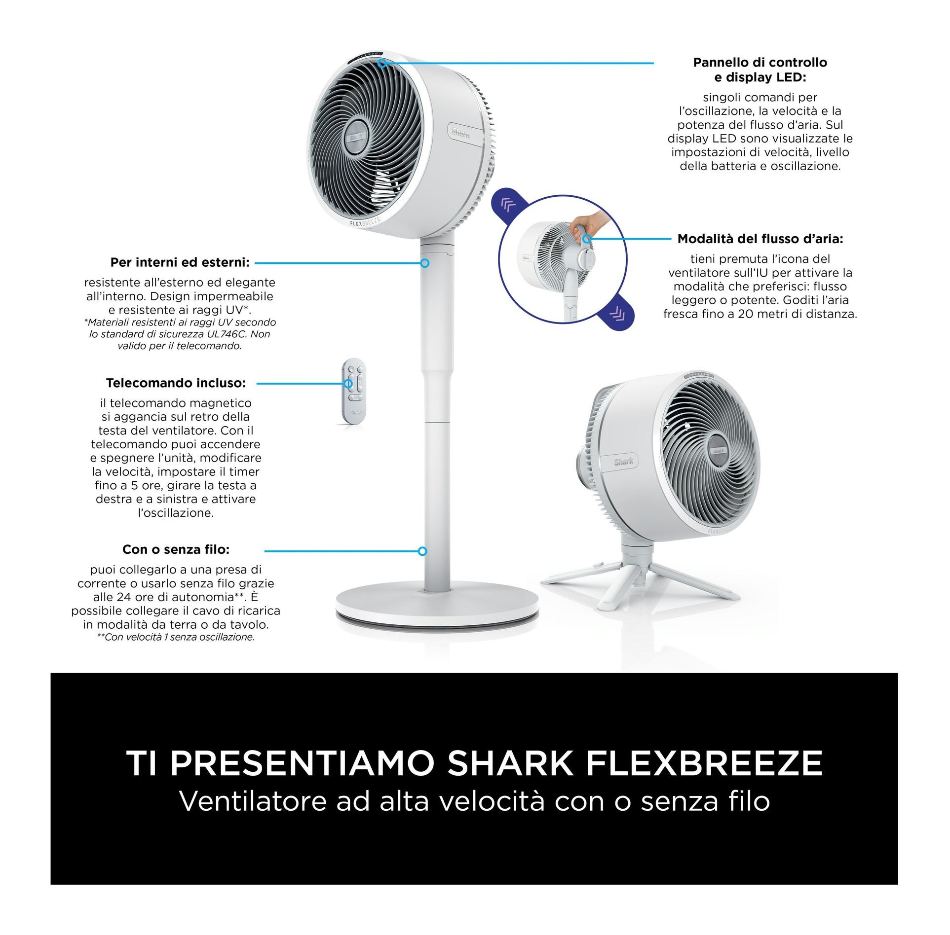 Ventilatore 12 in 1: con o senza filo, da tavolo o da terra, in ambienti interni ed esterni, con o senza nebulizzatore, per un totale di 12 modalità. Batteria con autonomia fino a 24 ore: usa FlexBreeze senza filo per goderti il fresco all’aperto.