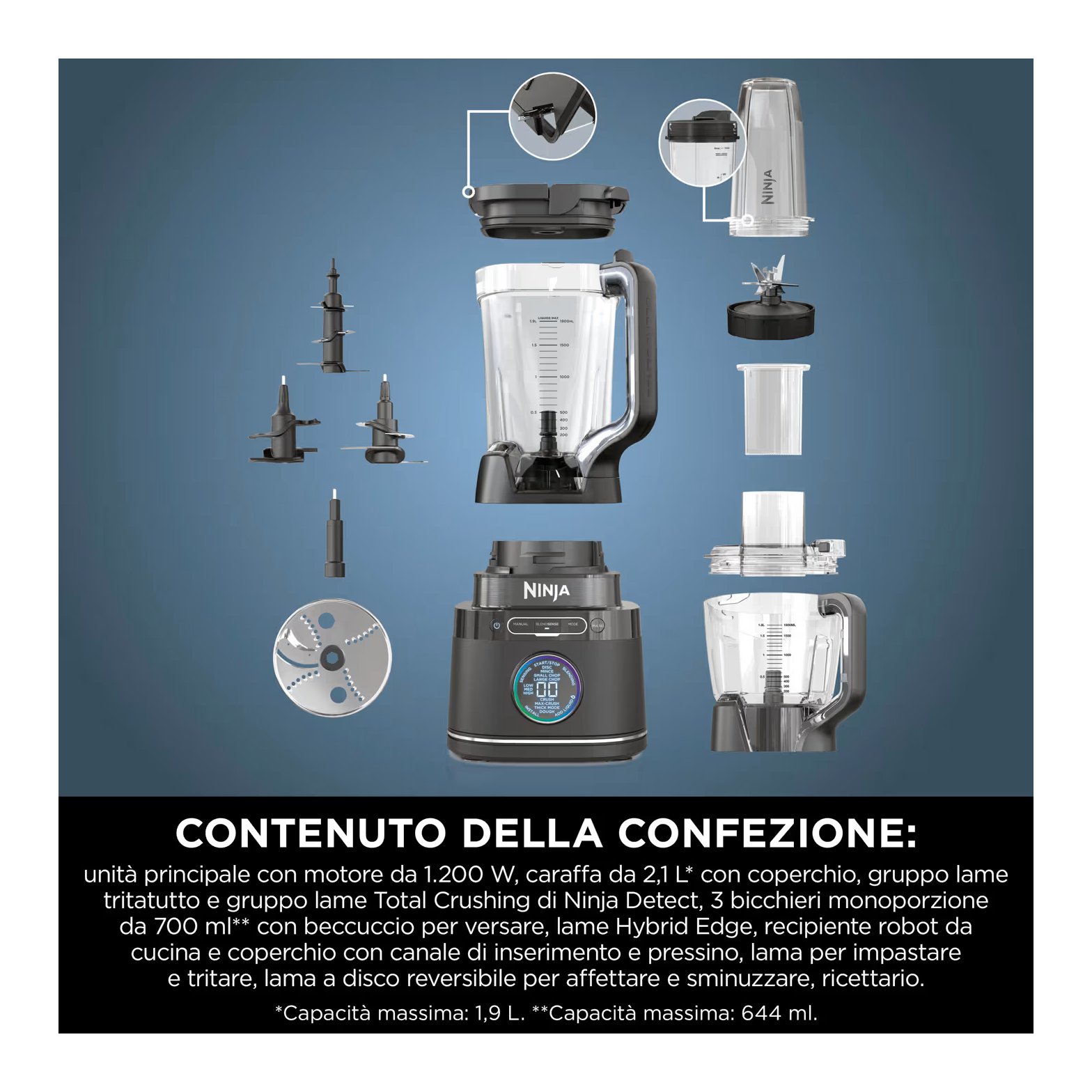 Tre apparecchi in uno: frullatore tradizionale, robot da cucina e frullatore personale con un’unica base. Robot da cucina multifunzione ad alta potenza Ninja Detect con unità principale con motore da 1200 W, caraffa da 2,1 L, recipiente del robot da cucina da 1,8 L e 3 tazze monoporzione da 700 ml