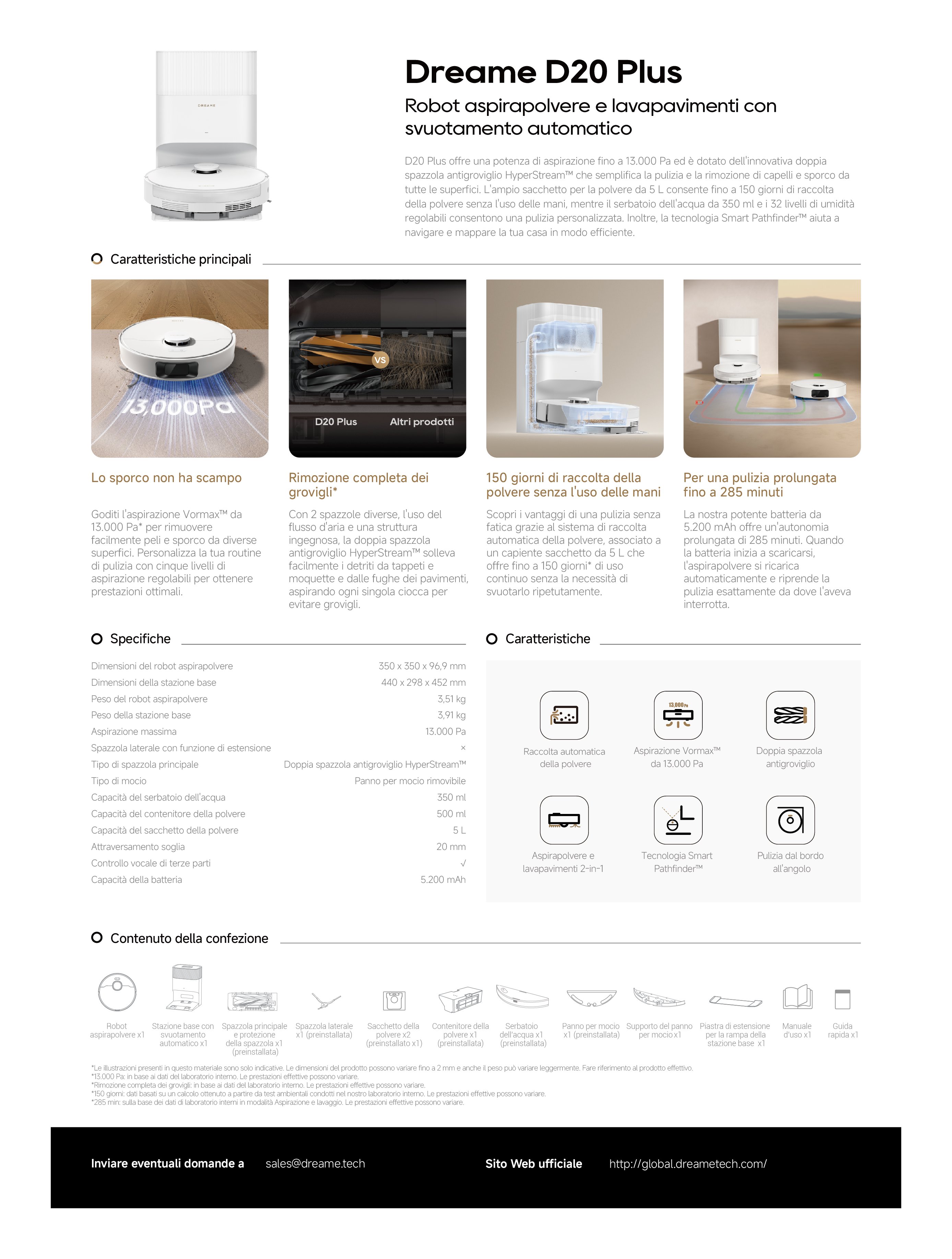 D20 Plus offre una potenza di aspirazione fino a 13.000 Pa ed è dotato dell'innovativa doppia spazzola antigroviglio HyperStream che semplifica la pulizia e la rimozione di capelli e sporco da tutte le superfici. L'ampio sacchetto per la polvere da 5 L consente fino a 150 giorni di raccolta della polvere senza l'uso delle mani, mentre il serbatoio dell'acqua da 350 ml e i 32 livelli di umidità regolabili consentono una pulizia personalizzata. Inoltre, la tecnologia Smart Pathfinder aiuta al navigare e mappare la tua casa in modo efficiente.