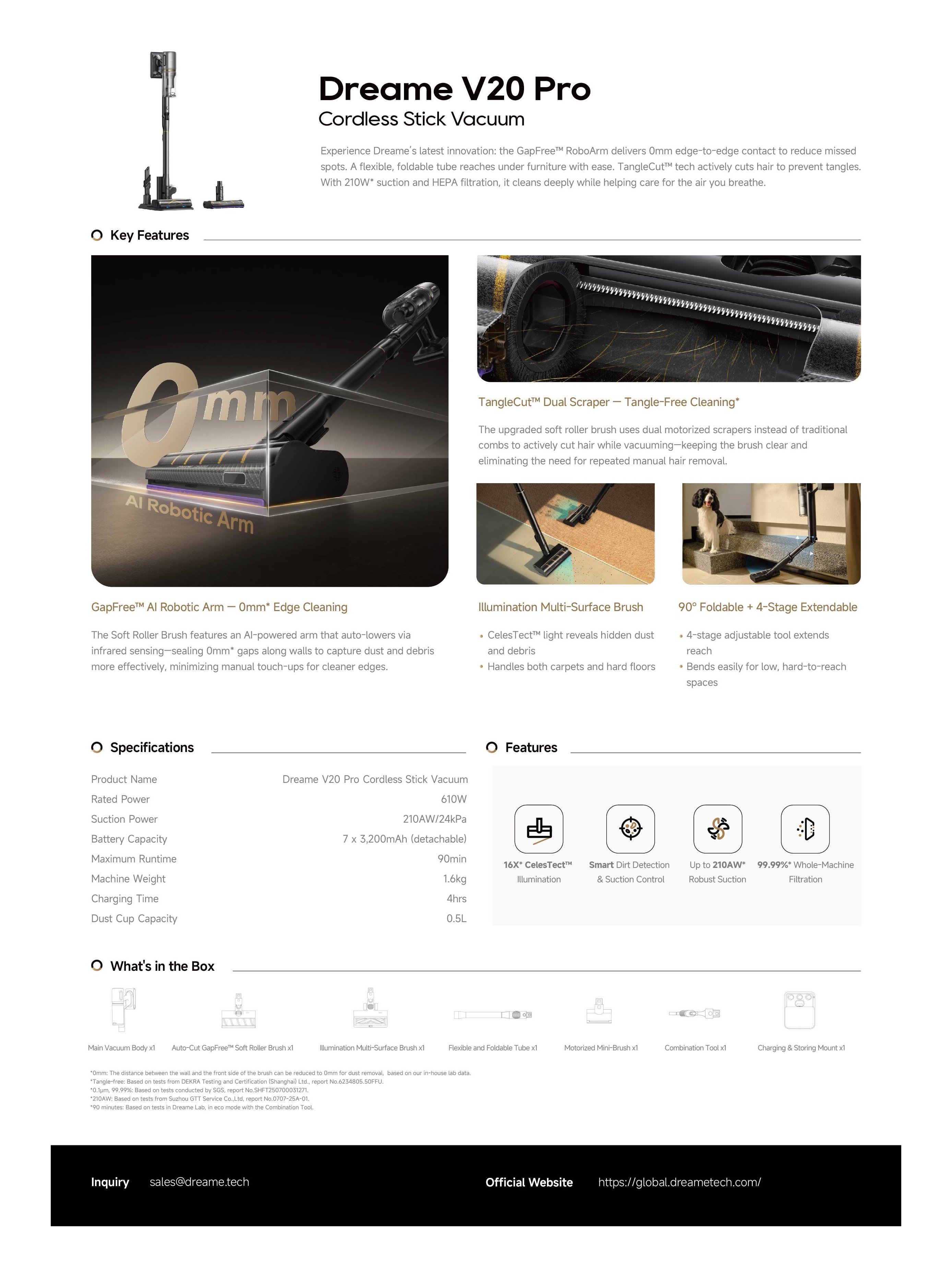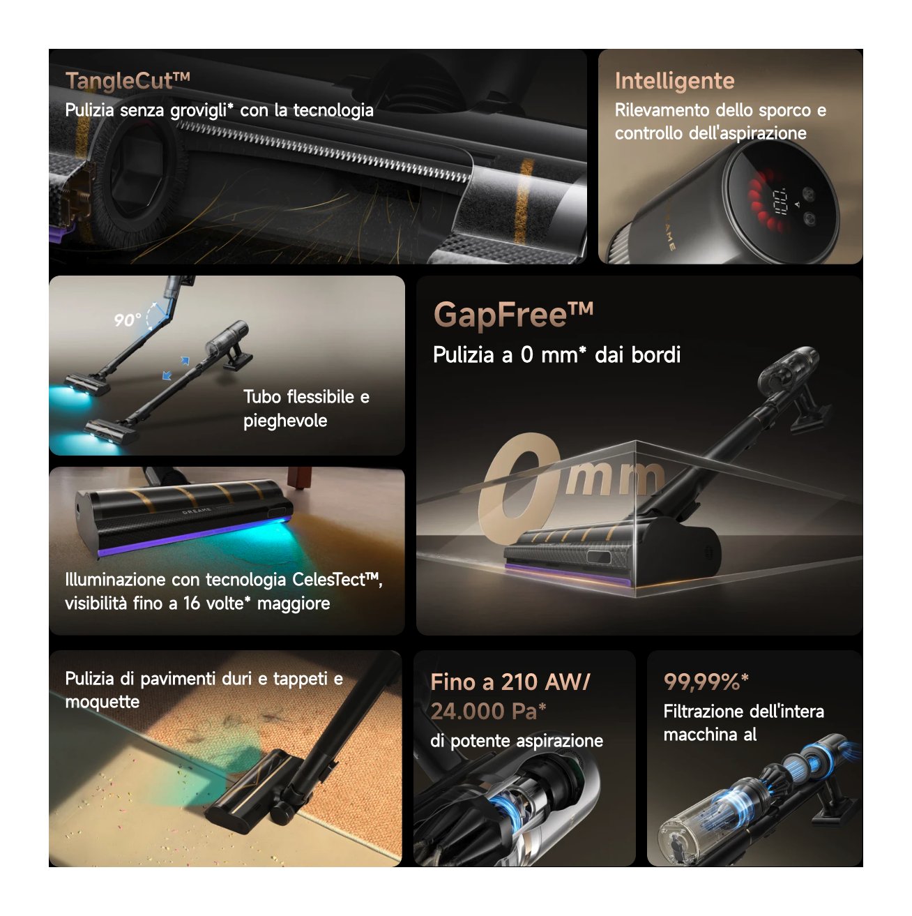 Scopri l'ultima innovazione di Dreame: il braccio robotico GapFree garantisce un contatto da bordo a bordo di 0 mm per ridurre i punti non puliti. Un tubo flessibile e pieghevole raggiunge facilmente gli spazi sotto i mobili. La tecnologia TangleCut taglia attivamente i capelli per evitare che si aggroviglino. Con una potenza di aspirazione di 24000 Pa e un filtro HEPA, pulisce in profondità contribuendo a prendersi cura dell'aria che respiri.