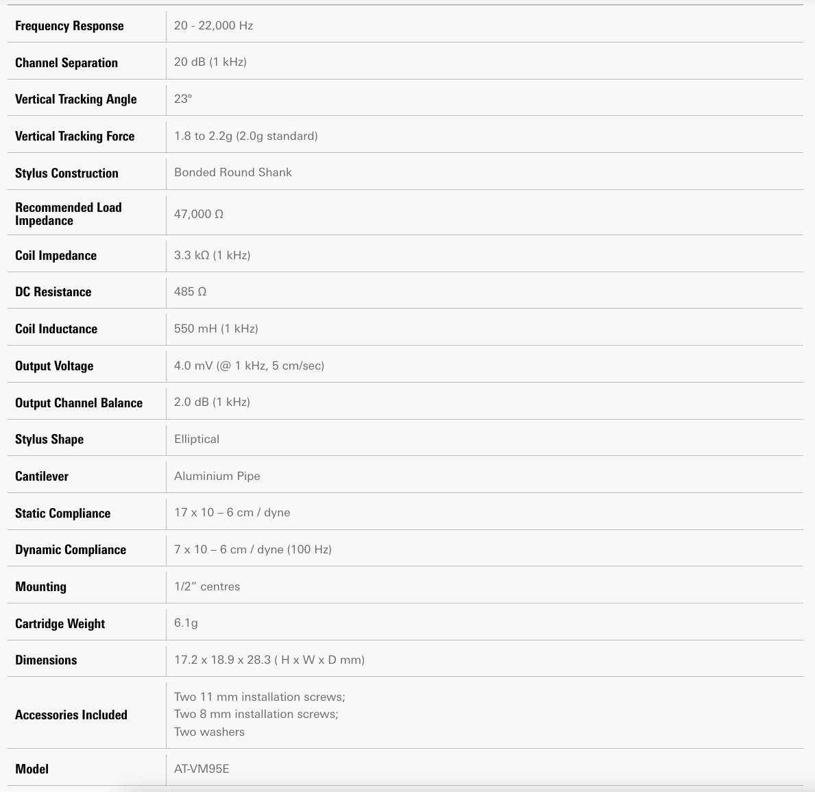 Questa cartuccia della serie VM95 con stilo ellittico da 0,3 x 0,7 mil si adatta a giradischi con attacco da mezzo pollice. Lo speciale design della bobina della cartuccia offre un potente livello di uscita di 4,0 mV. Offre inoltre un'eccellente separazione dei canali e una bassa distorsione per un'eccezionale qualità tonale.