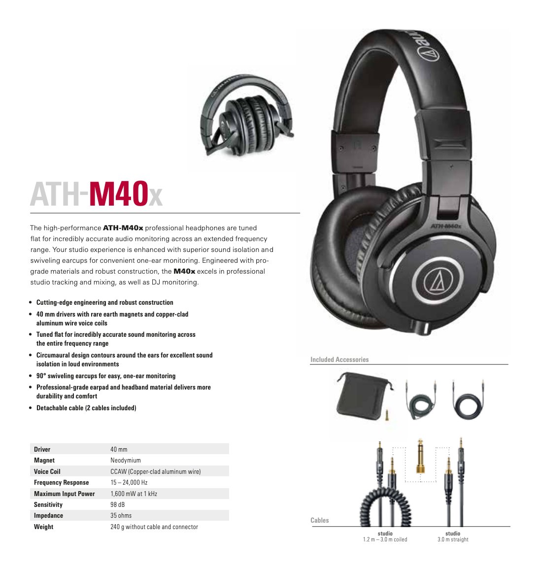 Le cuffie professionali ATH-M40x ad alte prestazioni sono ottimizzate per un monitoraggio audio incredibilmente accurato su un'ampia gamma di frequenze.
