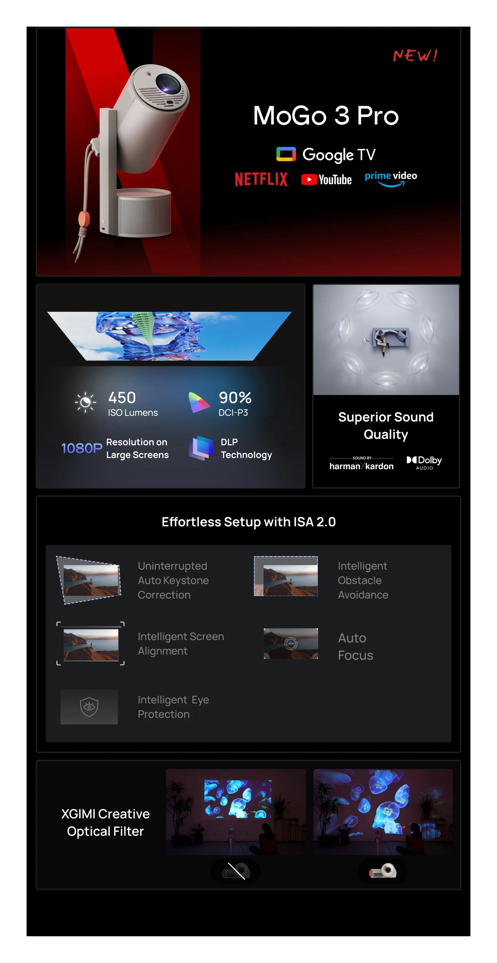 A casa o in viaggio, questo piccolo ed elegante proiettore portatile di XGIMI offre intrattenimento su grande schermo senza problemi. Grazie alla sua forma cilindrica, MoGo 3 Pro può essere facilmente orientato sulla sua base per visualizzare immagini Full HD HDR su qualsiasi superficie, dal pavimento al soffitto, in posizione diritta o angolata.