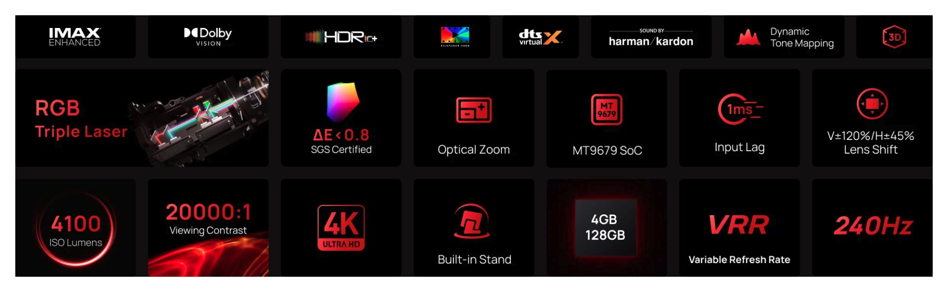 Immergiti in immagini realistiche e ricche di colori grazie al triplo laser RGB X-Master. 4100 ISO lumen di luminosità e un contrasto ultra-profondo di 20.000:1 conferiscono vivacità e profondità senza pari a ogni scena, di giorno e di notte.