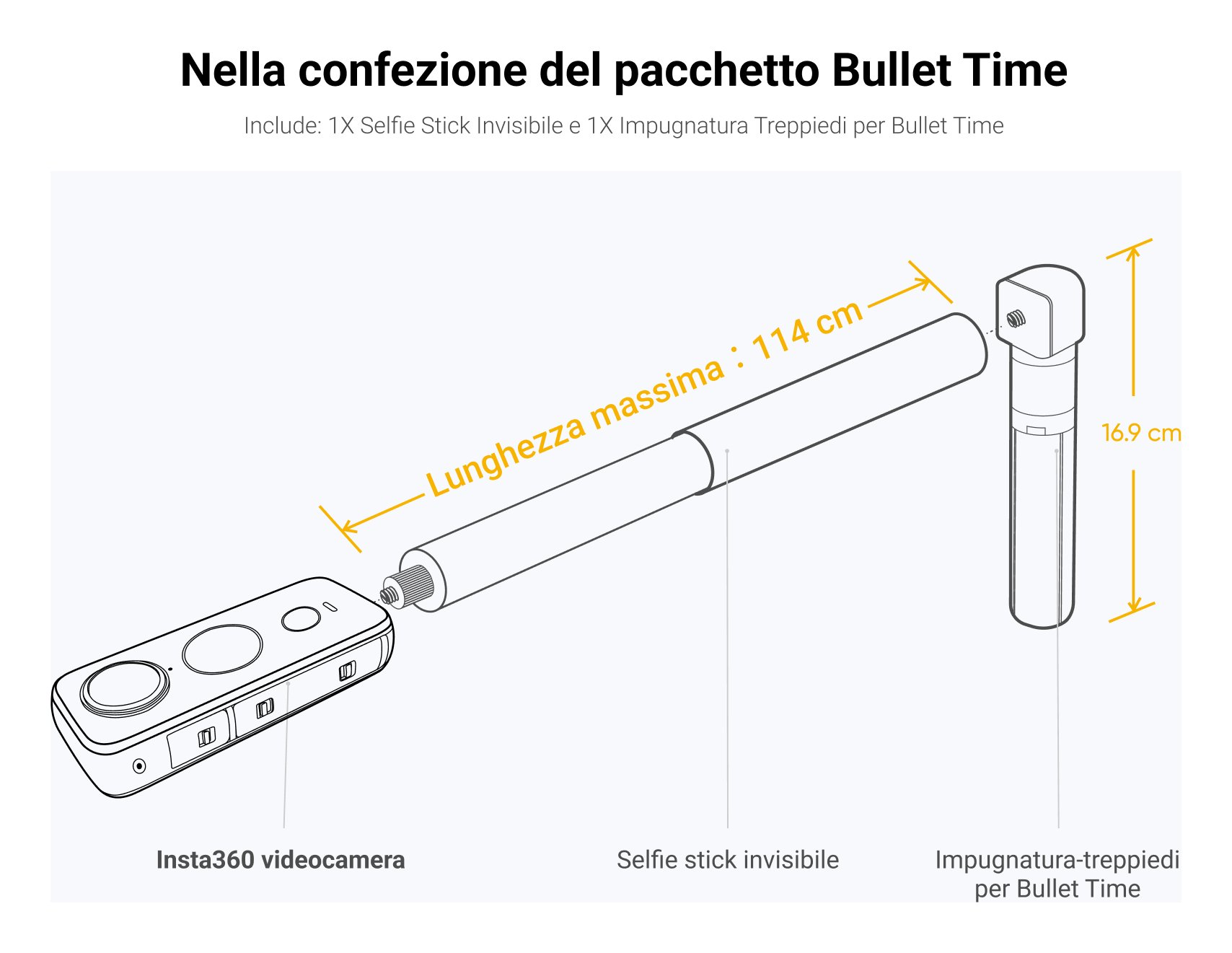 L'impugnatura per il treppiedi Bullet Time funge anche da treppiedi da tavolo e da impugnatura per selfie stick per far oscillare la fotocamera in alto. Il Pacchetto include 1 x Impugnatura per Bullet Time e 1 x Selfie Stick.