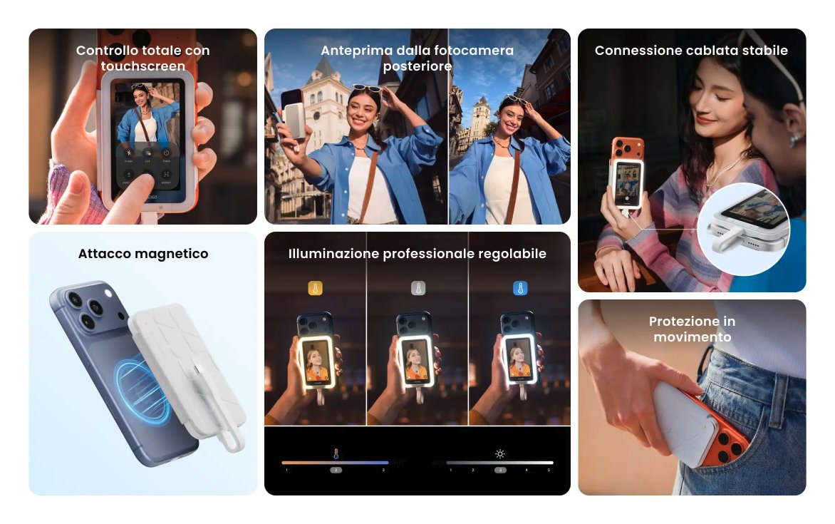 Guarda in tempo reale i tuoi selfie ripresi con la fotocamera posteriore del telefono, molto più potente di quella frontale. Sviluppato in collaborazione con AMIRO, esperti in strumenti tecnologici per la bellezza, offre 3 temperature di colore e 5 livelli di luminosità, per una pelle perfetta anche con poca luce.