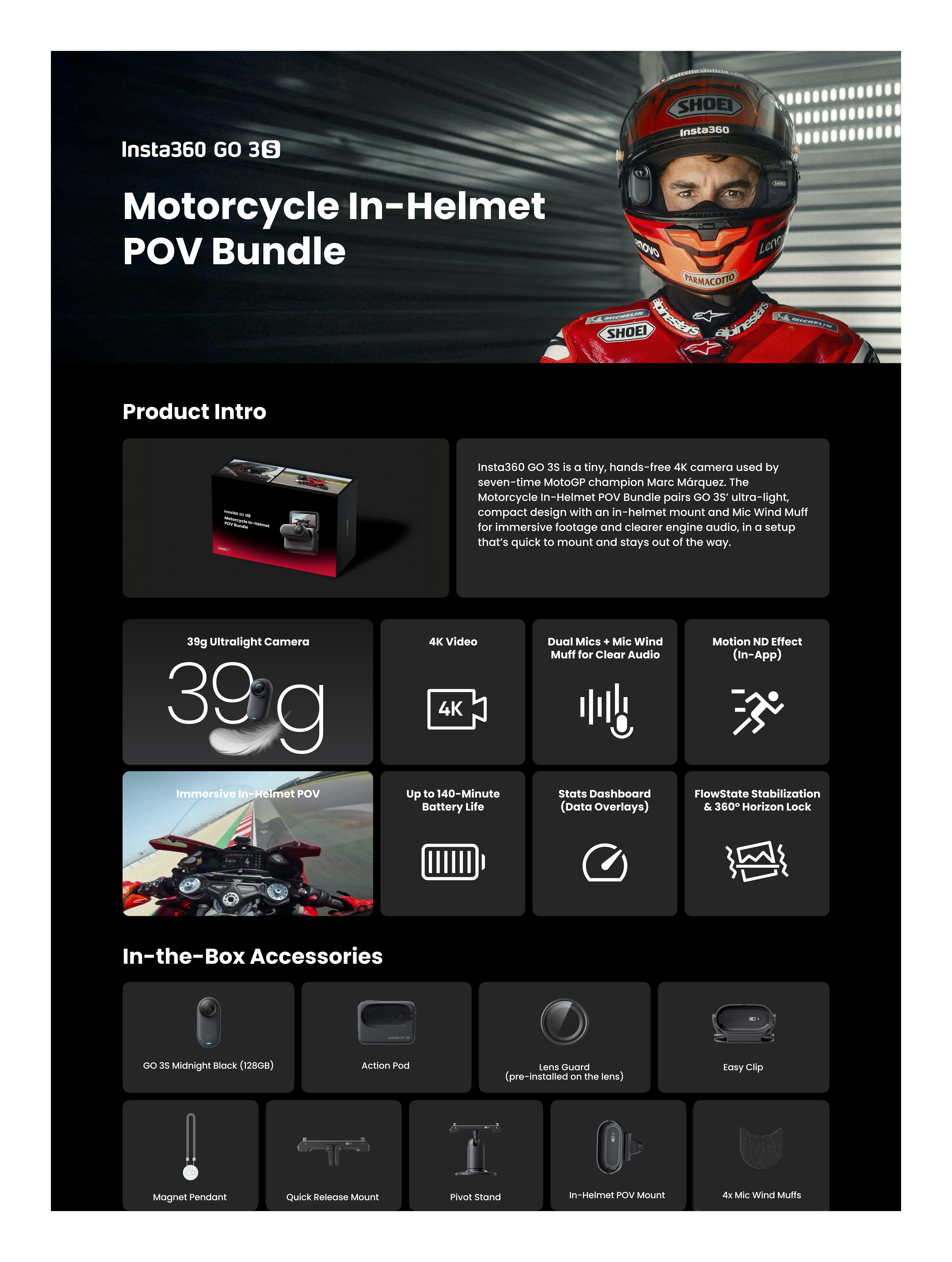 Insta360 GO 3S è una minuscola videocamera 4K a mani libere utilizzata dal sette volte campione del mondo di MotoGP Marc Márquez. Il pacchetto POV da casco per moto abbina il design ultraleggero e compatto della GO 3S a un supporto da casco e a una protezione antivento per microfono per riprese coinvolgenti e un audio del motore più nitido, in una configurazione facile da montare e che non intralcia.