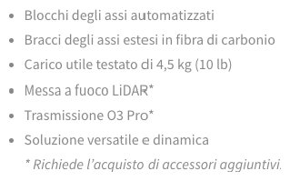 Stabilizzazione di livello professionale. Carico utile testato di 4,5 Kg.