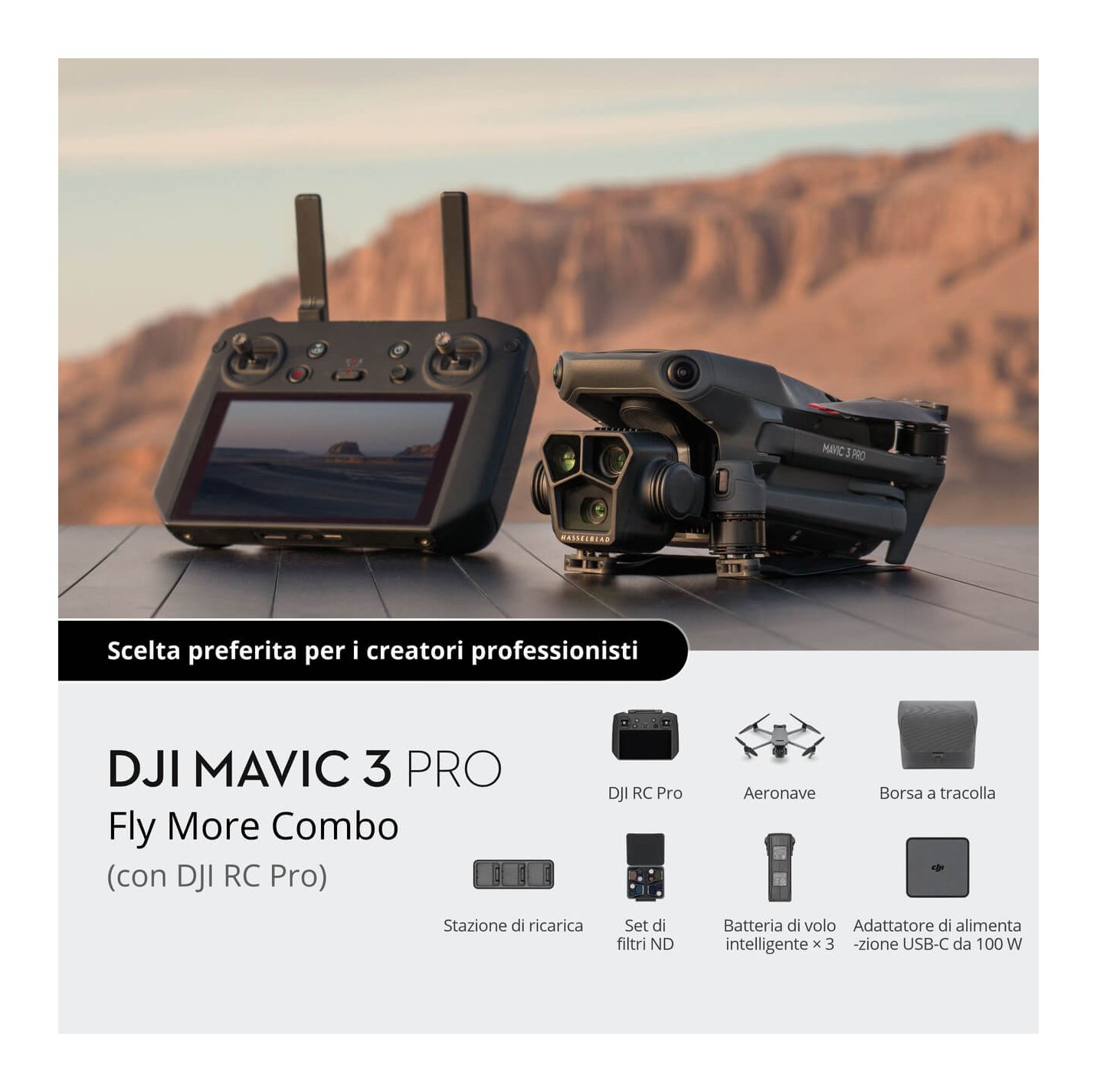 Il sistema a tripla fotocamera di Mavic 3 Pro apre le porte una nuova era per i droni dotati di 3 sensori e obiettivi con lunghezze focali diverse. Dotato di una fotocamera Hasselblad e di doppio teleobiettivo, Mavic 3 Pro apre la strada a nuove prospettive di ripresa, consentendoti di scatenare la tua libertà creativa eseguendo scatti e riprese di scenari affascinanti, esplorando lo storytelling fotografico e realizzando capolavori di livello cinematografico.