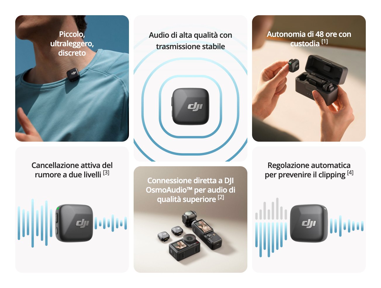 Ecco DJI Mic Mini, il microfono senza fili che racchiude prestazioni potentissime in un corpo ultraleggero. Garantisce la trasmissione stabile di audio di alta qualità, vanta una batteria a lunga durata e la connessione diretta con i prodotti dell'ecosistema DJI OsmoAudio. Vivi un'esperienza creativa unica, registrando audio ricchi e definiti che daranno ancora più valore ai tuoi contenuti. Ti basterà un attimo per aprire la custodia e rendere ogni progetto perfetto con un audio impeccabile.