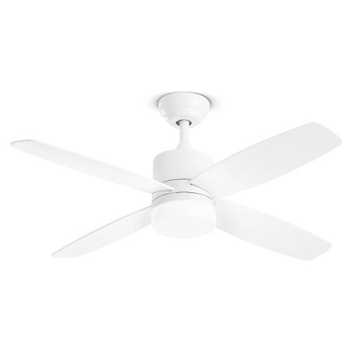 Ventilatore in metallo colore bianco, 4 pale in legno bianco con diffusore in abs e modulo LED con tre intensità di colore luce. Telecomando a onde radio incluso.