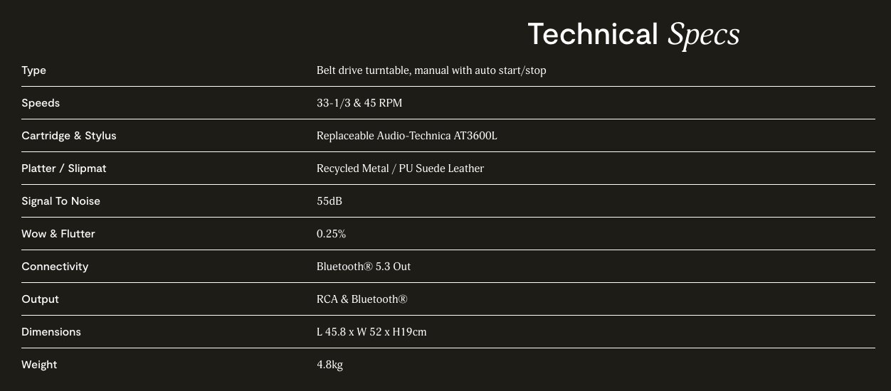 Dotato di Bluetooth 5.3 aggiornato per uno streaming più fluido, di una puntina Audio-Technica AT3600L di precisione e di una lavorazione artigianale in bambù sostenibile, offre una riproduzione calda e ricca con stile.