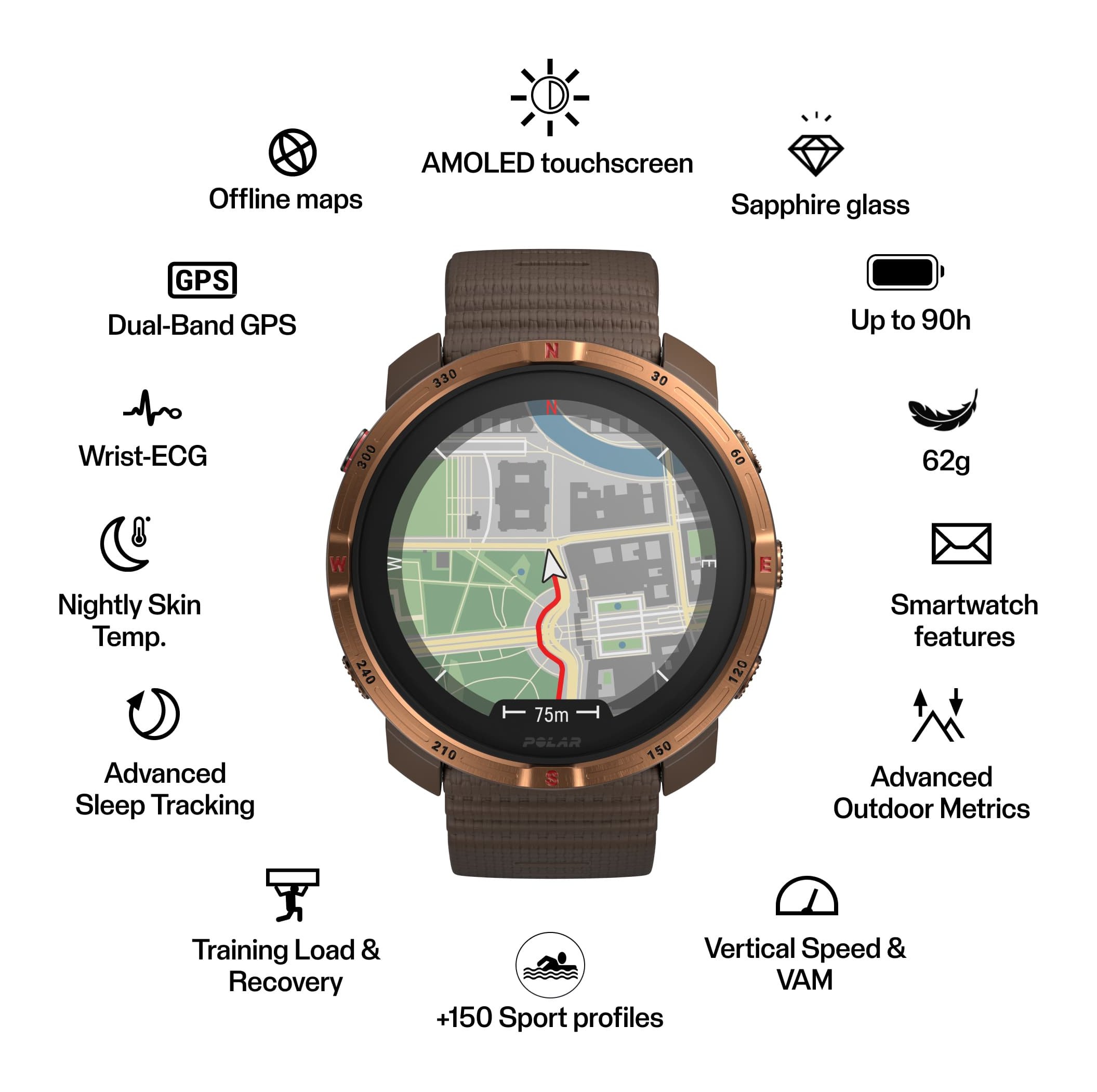 Polar Grit X2 è un outdoor watch compatto e resistente, pensato per le grandi avventure e la performance quotidiana. Dotato di funzioni di allenamento avanzate, un display AMOLED in vetro zaffiro e una navigazione ad alta precisione con mappe a colori, è progettato per accompagnarti sui sentieri e nella vita di tutti i giorni.