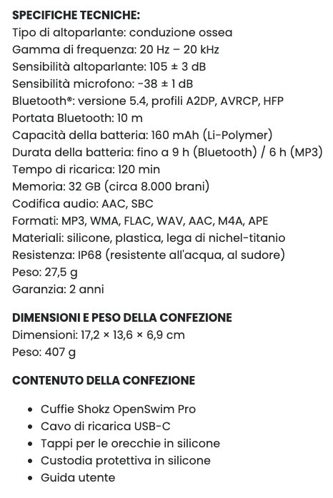 Passa senza problemi dall'acqua alla terraferma con OpenSwim Pro con certificazione IP68. Le cuffie possono essere immerse fino a 2 metri per 2 ore e riprodurre musica senza interruzioni. Passa dalla modalità Bluetooth a quella MP3 senza interruzioni con un pulsante nell'app Shokz. OpenSwim Pro è progettato per l'allenamento sia in acqua che a terra: impermeabile, versatile, sicuro e stabile.
