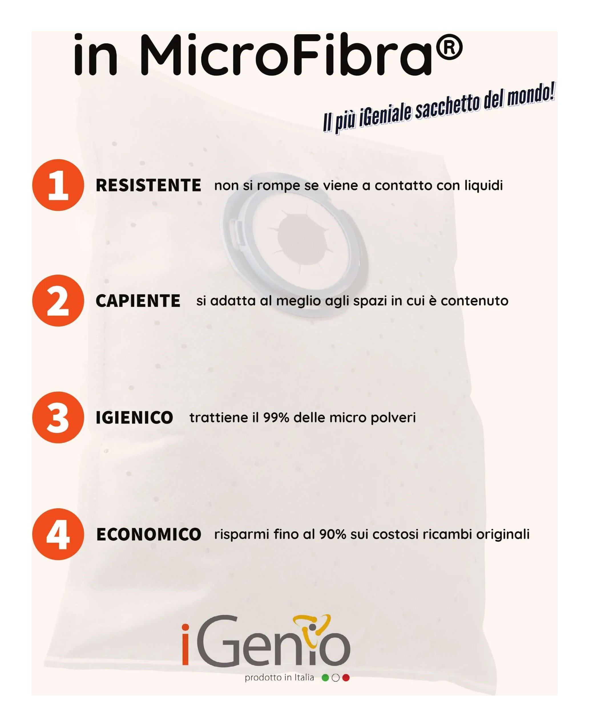 Realizzato con tre componenti in tessuto microfibra che garantiscono durata e resistenza, trattenendo efficacemente le particelle di micro-polvere. Il sacchetto è universale ed è stato progettato per essere facilmente inserito in qualsiasi modello di aspirapolvere a Traino. Misura del sacchetto universale: 250 x 270 mm