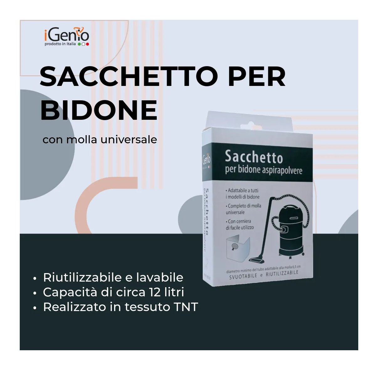 Realizzato in tessuto TNT. Il sacchetto è stato progettato per essere facilmente inserito nel bidone aspiratutto ed agganciato con molla al tubo di entrata aria all’interno dello stesso. Dotato di cerniera per lo svuotamento è quindi riutilizzabile e lavabile. Il sacchetto ha una capacità di circa 12 litri e viene venduto in confezione da 1 pz. Diametro minimo del tubo adattabile alla molla 6,5 cm.