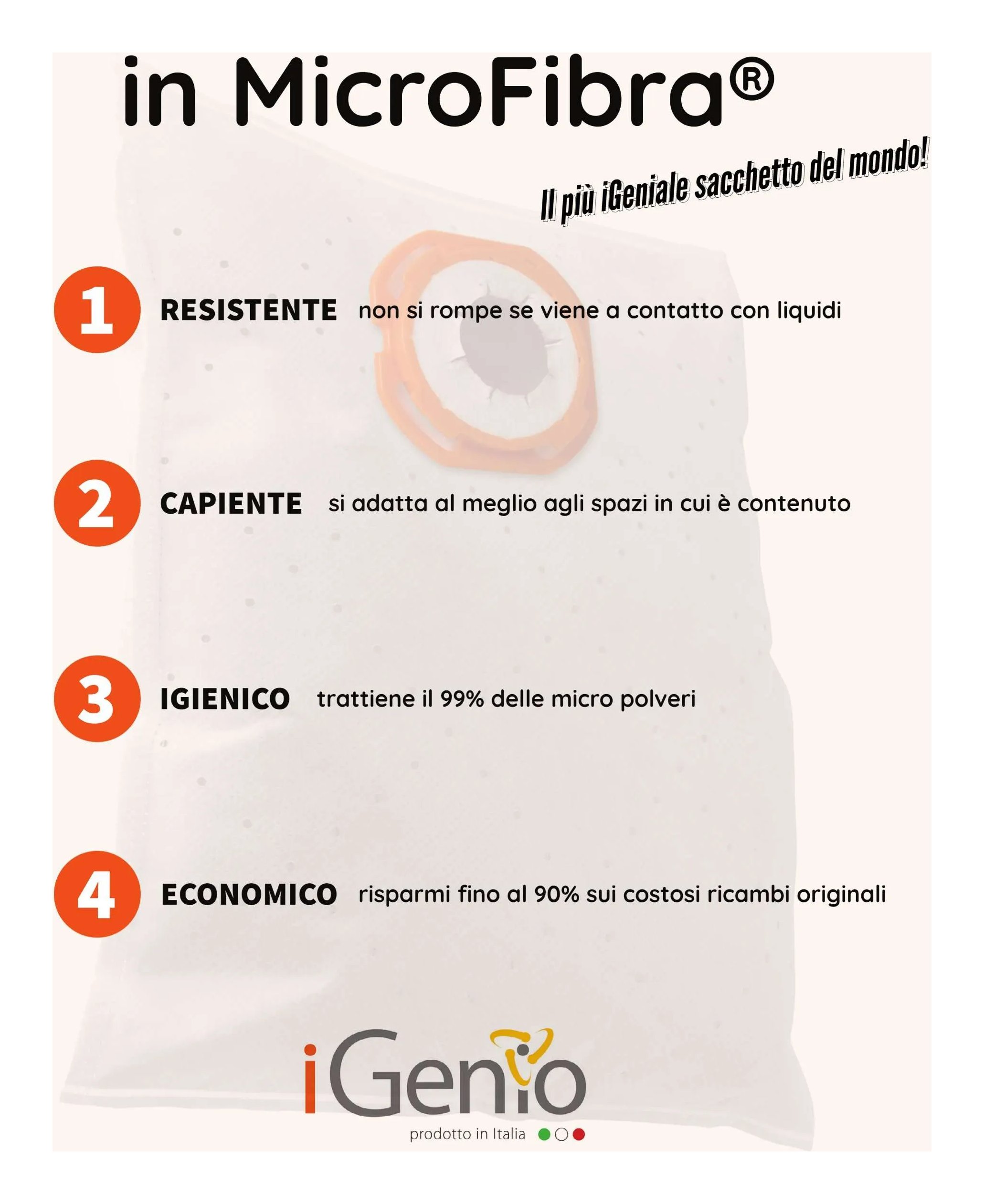 Realizzato con tre componenti in tessuto microfibra che garantiscono durata e resistenza, trattenendo efficacemente le particelle di micro-polvere. Il sacchetto è universale ed è stato progettato per essere facilmente inserito in qualsiasi modello di scopa elettrica. Misura del sacchetto universale: 250 x 150 mm