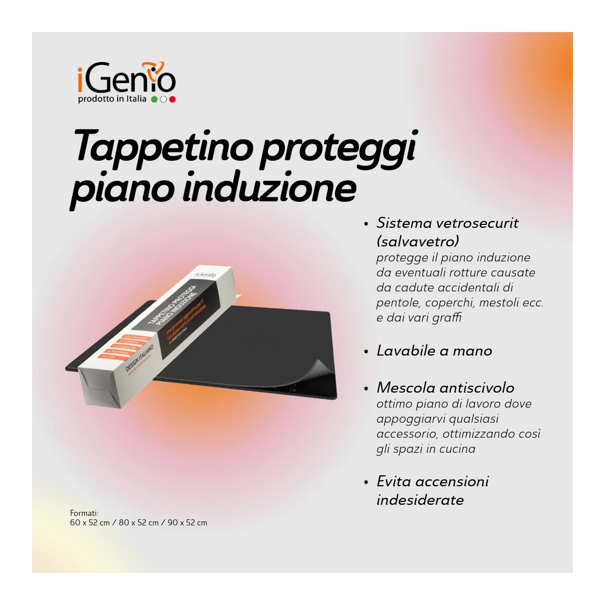 Il tappetino iGenio grazie al sistema vetrosecurit (salvavetro) è l’accessorio perfetto per proteggere il piano induzione da eventuali rotture causate da cadute accidentali di pentole, coperchi, mestoli ecc. e dai vari graffi. Grazie alla sua resistenza all’urto e alla mescola antiscivolo, risulterà un ottimo piano di lavoro dove appoggiarvi qualsiasi accessorio, ottimizzando così gli spazi in cucina. Realizzato con materiale resistente agli urti – Etilene Ottano EPDM (no zolfo), non assorbe gli odori ed è resistente all’usura – lunga durata. Il tappetino evita anche accensioni del piano cottura dovute al contatto involontario con i comandi. Flessibile e resistente, facile da riporre (arrotolabile) e lavabile a mano.