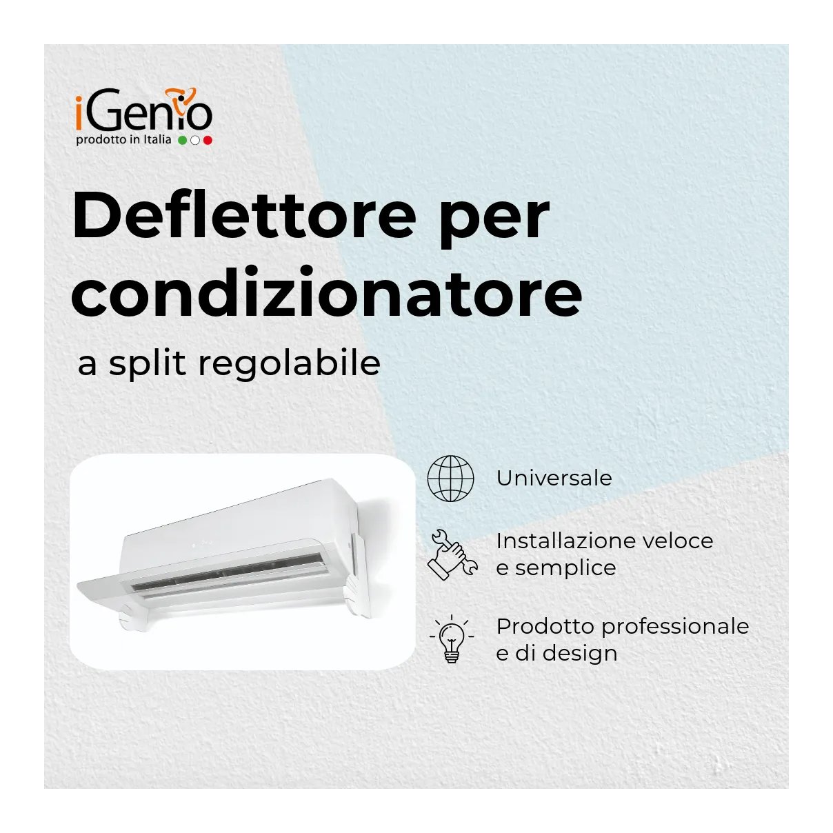 Grazie alla sua forma curva e alle sue tre angolazioni, il deflettore d’aria iGenio devia e concentra il getto d’aria fredda/calda verso il soffitto, fornendo una temperatura omogenea ed equilibrata in casa e ufficio evitando di essere esposti ad un soffio diretto. Il deflettore con barre in pvc espanso e pannello in policarbonato trasparente inoltre permette di vedere il display del condizionatore con la temperatura impostata. il deflettore iGenio è universale: si può abbinare a condizionatori split di qualsiasi marca/dimensione. L’installazione è semplice e veloce senza utilizzo di viti.