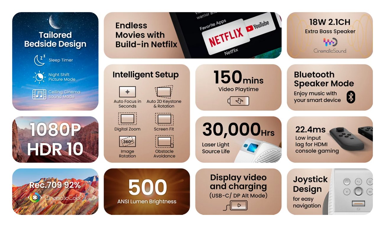 Il design flessibile della base del GV50, simile a un treppiede integrato, è fatto su misura per la proiezione sul soffitto dal comodino, offrendoti la libertà di proiettare da qualsiasi angolazione desiderata mentre ti rilassi nel comfort del tuo letto.