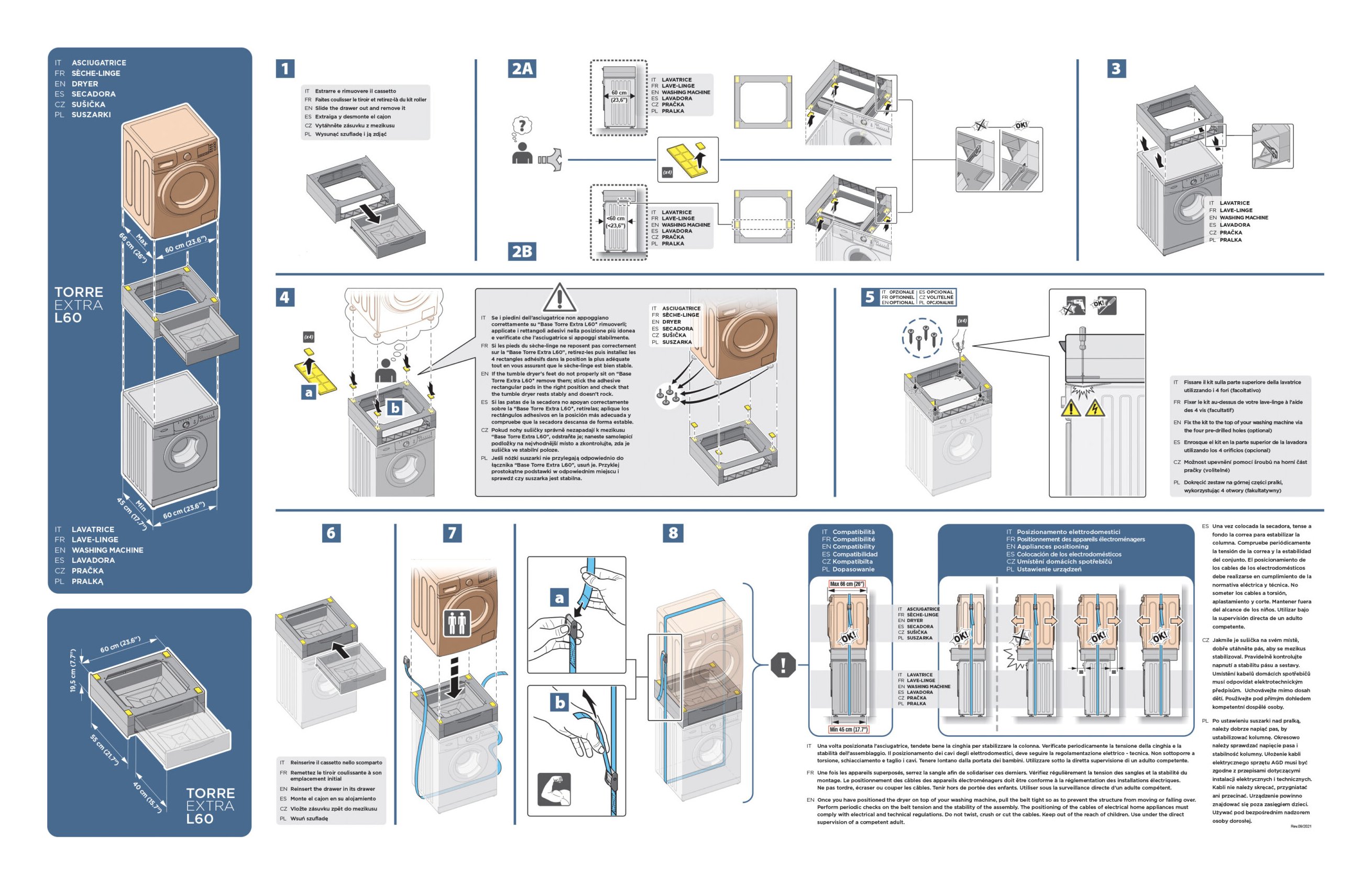 Consente di guadagnare spazio posizionando l’asciugatrice sopra alla lavatrice. Compatibile con tutte le lavatrici con carica frontale profonde min. 45 cm, e asciugatrici con carica frontale profonde anche oltre 60 cm (la distanza tra i piedini dell’asciugatrice dovrà essere max 54cm).