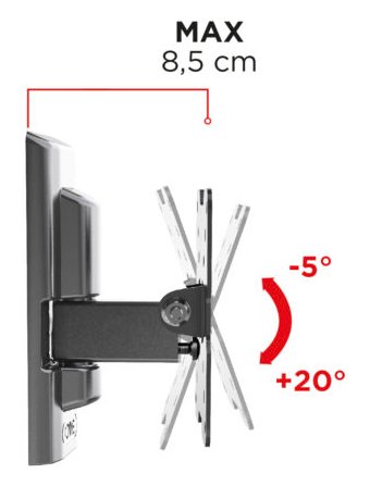 Flatstyle FTR100 è un supporto adatto a tutte le TV con foratura VESA 50-75-100 mm, da 14 a 25 pollici, con una portata massima di 20 kg e distanza da muro di massimo 8,5 cm.