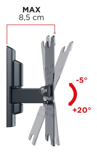 Flatstyle FTR200 è un supporto adatto a tutte le TV con foratura VESA 50-75-100-200 mm, da 26 a 45 pollici, con una portata massima di 30 kg e distanza da muro di massimo 8,5 cm.