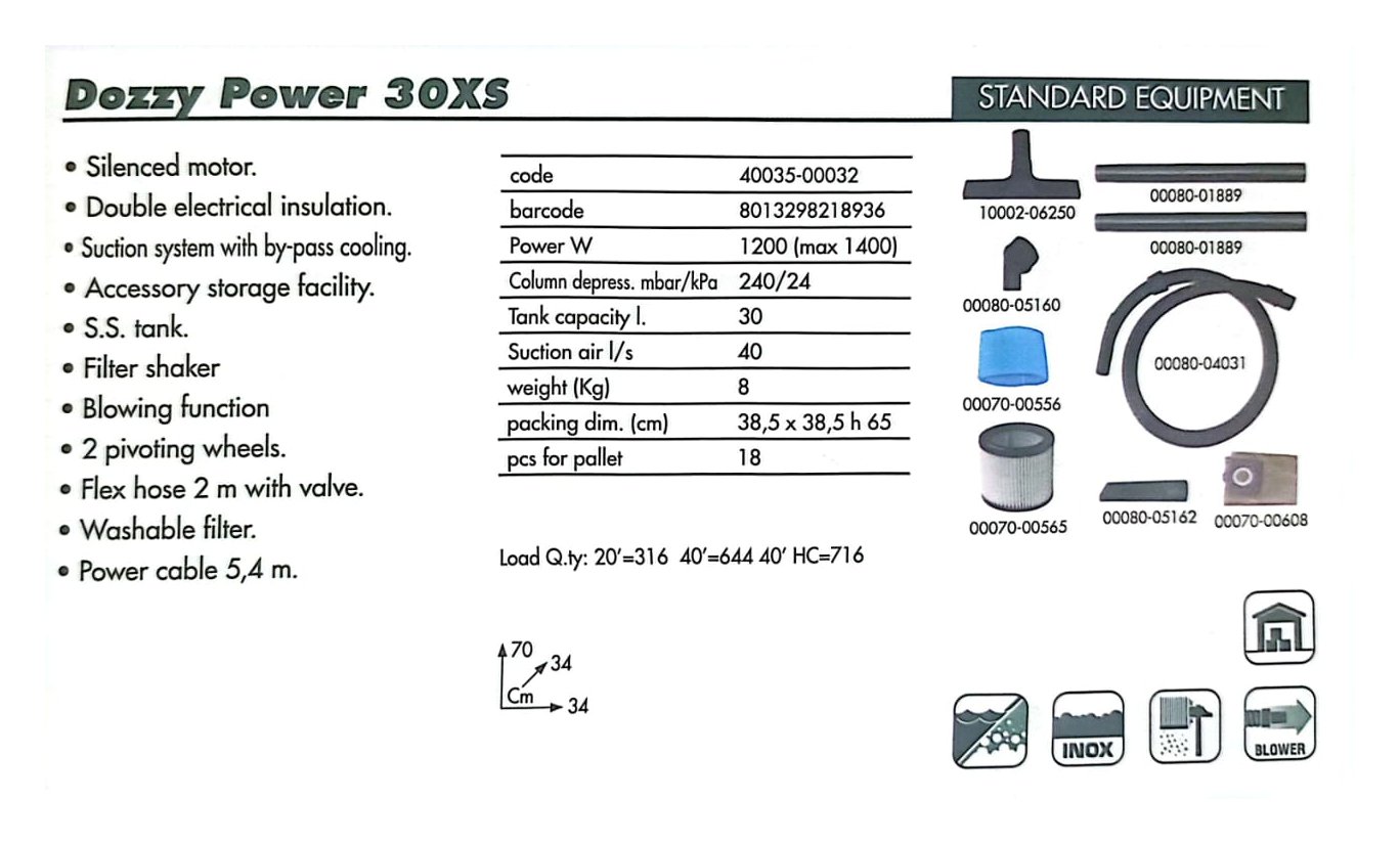 DOZZY 30XS è un aspirapolvere molto potente con funzioni multiple: aspirazione liquidi, aspirazione solidi e funzione soffiante. Ideale per casa, cantine, uffici, piccole officine, interni auto, cucine, cortili ecc.