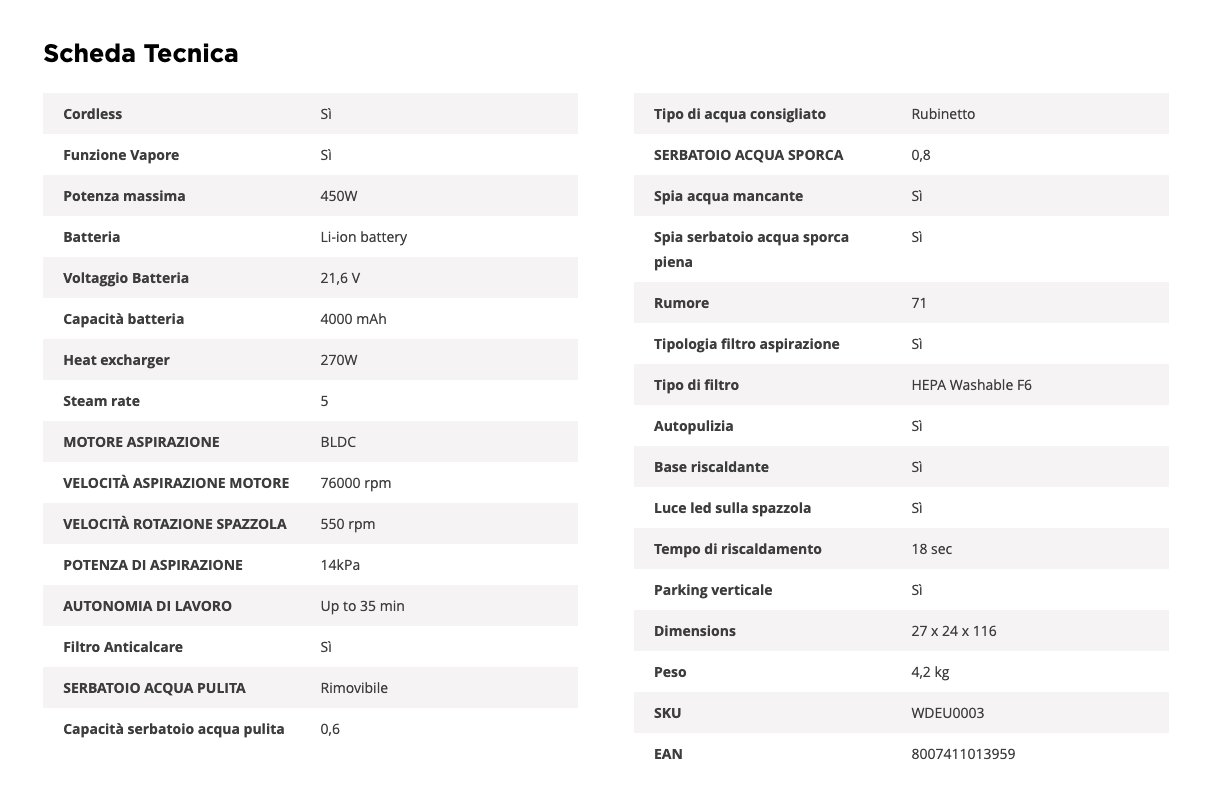 Polti RollySteam WD30C è il lavapavimenti multifunzione senza filo che aspira, lava e igienizza con vapore, eliminando fino al 99,999% di batteri, germi e funghi senza l’uso di detergenti chimici. L’autonomia fino a 35 minuti permette di pulire tutta la casa senza interruzioni. Il sistema di autopulizia con asciugatura automatica del rullo e la funzione Calc Cleaning mantengono puliti la spazzola e il circuito interno, per prestazioni sempre al top.