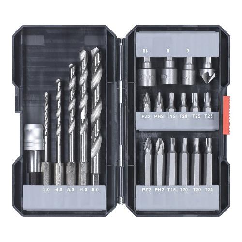 Set combinato di inserti e punte, 22 pezzi, con 12 inserti delle misure e forme più comuni, 6 inserti da 25 mm, 6 inserti da 50 mm, più 5 punte per metallo, 3 bussole, 1 allargatore, 1 portainserti a cambio rapido; versioni degli inserti da 25 mm: ph2, pz2, t15, t20 e t25; versioni degli inserti da 50 mm: ph2, pz2, t15, t20 e t25, per raggiungere anche le viti inserite più a fondo; alcuni dei tipi di accoppiamento più importanti sono ripetuti, tutti gli inserti sono in cromo-vanadio; punte per metallo di 3, 4, 5, 6 e 8 mm di diametro, in hss, con estremità a 118°; bussole per avvitare dadi, allargatore per accecare viti a raso, in cromo-vanadio, tutti gli inserti e le punte hanno un gambo e6.3 e sono adatti a tutti i comuni trapani e avvitatori a batteria, set il s-box.