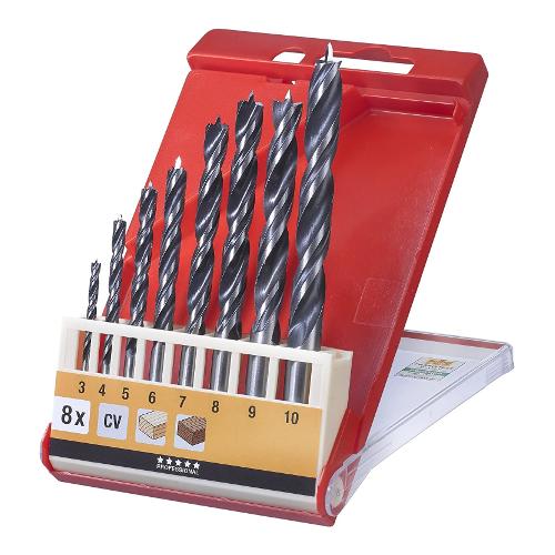 Set punte elicoidali per legno, acciaio cv, forgiata senza asportazione di trucioli, forma elicoidale a due smussi, per linee dritte stabili, colore nero, spirali rettificate a lucido, con punta di centraggio e tagliente di spalla, per fori precisi senza schegge, codolo cilindrico, qualità industriale, per legno duro e tenero.