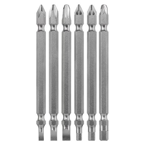 L doppio set di bit da 6 pezzi contiene i 12 attacchi più comuni (PH1, 2, 3; PZ1, 2, 3; TG4, 5, 6; HEX2, 3, 4). Basta capovolgere il bit nella macchina e si è pronti per l´avvitamento successivo. I bit lunghi 100 mm sono perfettamente adatti anche per raggiungere viti più profonde. I bit ph e pz sono dotati dei mega grip rib. Superficie con finitura satinata.