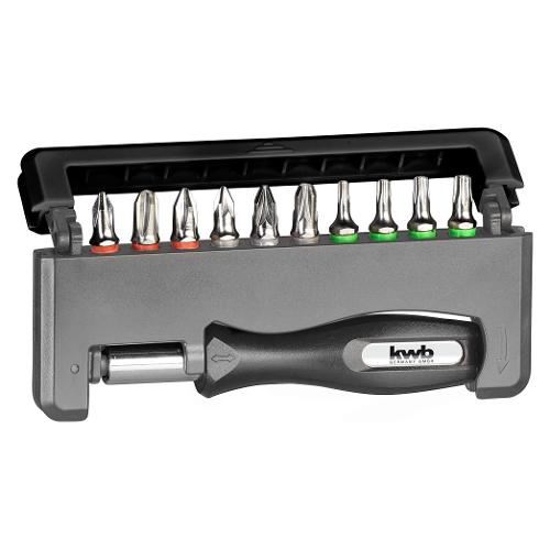 Set da 12 pezzi che entra in qualsiasi taschino della camicia e tasca dei pantaloni. Contiene un avvitatore con portabit magnetico rimovibile per avvitatori a batteria. Contiene bit industrial steel in acciaio tq60 per i lavori di avvitamento più comuni. Per l´identificazione rapida della forma del bit, i bit kwb sono contrassegnati con un pratico anello colorato.