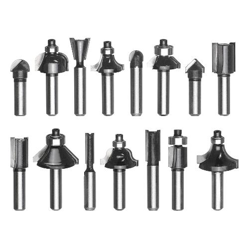 Frese in metallo duro dotate di gambo da 8 mm di diametro, frese per la profilatura di spigoli di legno come frese spuntatrici, frese per smussare, frese per quarti di cerchio, frese a semigola, frese per arrotondamento di spigoli e frese per profilare. Con cuscinetto di appoggio a sfera per una facile fresatura lungo gli spigoli di legno. Kit completo di frese per scanalature con diverse larghezze di scanalatura, frese per scanalature a v, frese a semigola e frese a coda di rondine per lavori su tavole di legno, in una cassetta in legno.