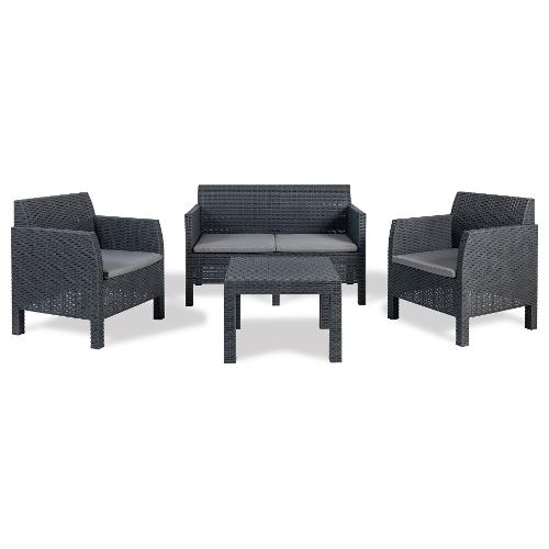 Il set da giardino Matilde da 4 posti è composto da 2 sedute con cuscini, un divano con 2 sedute con cuscini e 1 tavolo da giardino, perfetto per creare un'area relax all'aperto. Realizzato in Polipropilene resistente ai raggi UV, questo set è progettato per durare nel tempo. Le poltrone e il divano sono dotati di cuscini imbottiti per garantire il massimo comfort. Facile da montare e mantenere, il set è l'ideale per godersi momenti di relax all'aria aperta con stile