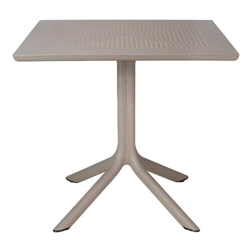 Appositamente studiato per occupare poco spazio, Clip è un tavolo professionale quadrato in resina fiberglass con gamba centrale a quattro razze e piano in DurelTop foto-inciso con un motivo bucherellato rotondo