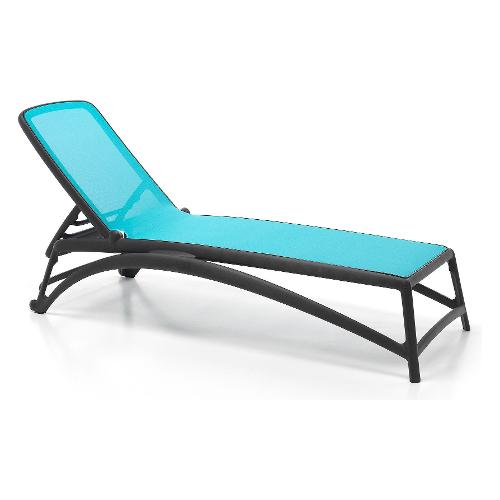 Forme ergonomiche che si adeguano in modo uniforme ed elastico allo scarico del peso e design filante per Atlantico, lettino prendisole con struttura in resina fiberglass e tessuto traspirante e ricambiabile. Schienale regolabile su quattro posizioni