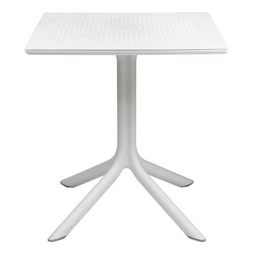 Appositamente studiato per occupare poco spazio, Clip è un tavolo professionale quadrato in resina fiberglass con gamba centrale a quattro razze e piano in DurelTop foto-inciso con un motivo bucherellato rotondo