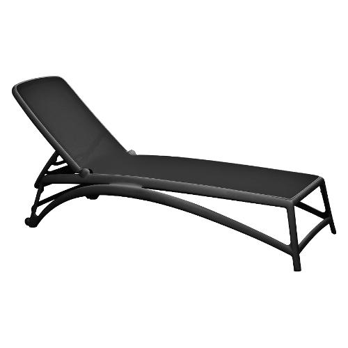 Forme ergonomiche che si adeguano in modo uniforme ed elastico allo scarico del peso e design filante per Atlantico, lettino prendisole con struttura in resina fiberglass e tessuto traspirante e ricambiabile. Schienale regolabile su quattro posizioni