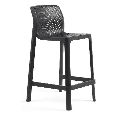 Linee fluide per lo sgabello monoscocca Net Stool Mini in resina fiberglass. Decorato dal particolare motivo a fori quadrati, nella versione mini è adatto ad un utilizzo indoor a servizio di bar, isole o banconi cucina