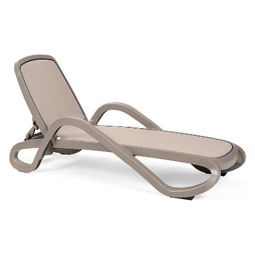 Lettino prendisole con braccioli. Struttura tubolare in Polipropilene trattato anti-uv e colorato in massa. Interno in tessuto sintetico traspirante e ricambiabile. Schienale reclinabile in 4 posizioni, con piedini antiscivolo e rotelline