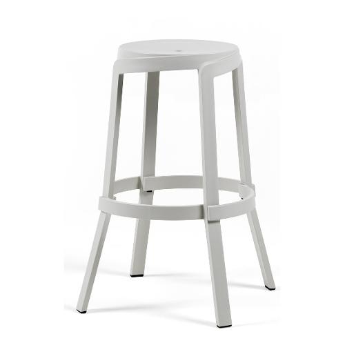 Sgabello alto in plastica riciclata dal design lineare e sezioni ad alto spessore ispirate ai fasci lignei. La particolare mescola blend presenta volute striature uniformate dal color Terra e una texture opacizzata a effetto vintage